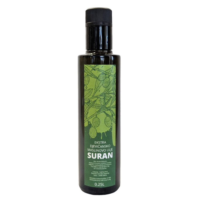 Suran je naše vrhunsko ekstra djevičansko maslinovo ulje proizvedeno isključivo od sorte 100% oblica, poznate po intenzivnom okusu i bogatim aromama. Ova autohtona dalmatinska sorta daje ulju jedinstvenu notu svježine, blage pikantnosti i dugotrajnog aftertastea koji ostaje u ustima.